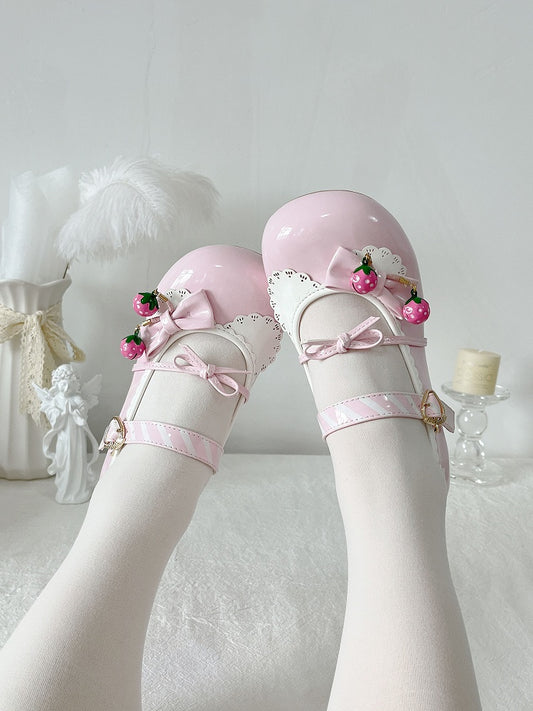 Charms Bell Snap Pink with Lolita Shoes Low-heel Sweet Removable Strawberry-shaped Strawberry