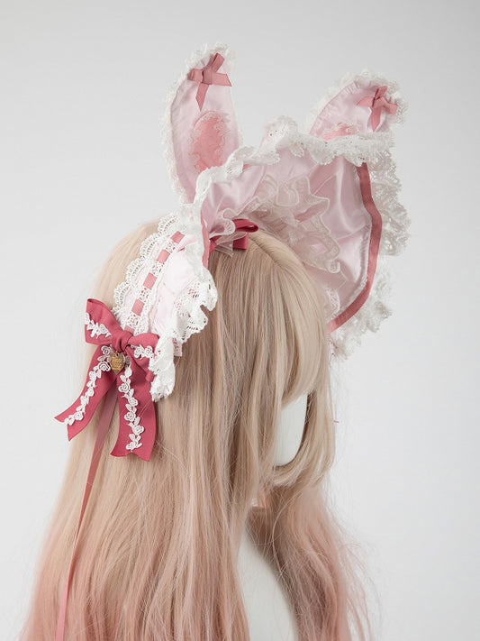 Pastel Bunny-Ear Heart-Charm Ruffled with Bonnet Lace Pink Bows