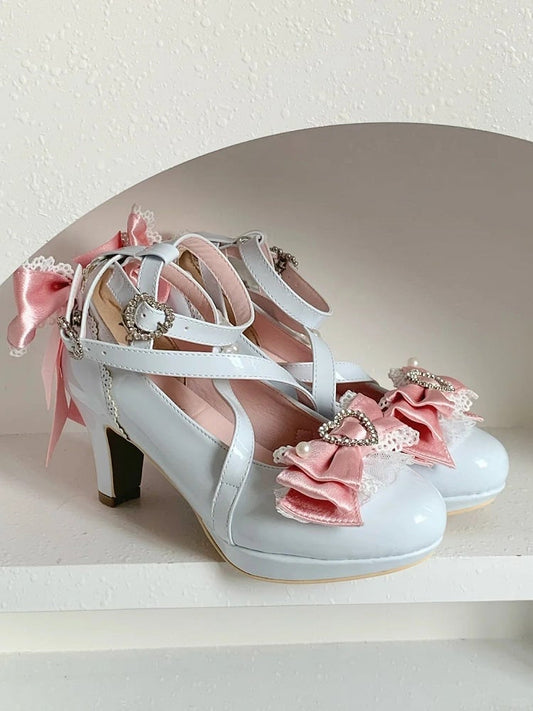 7cm Heel Straps Blue Hime Key Charm Lolita with Heeled Pink on Crossed Shoes Bow