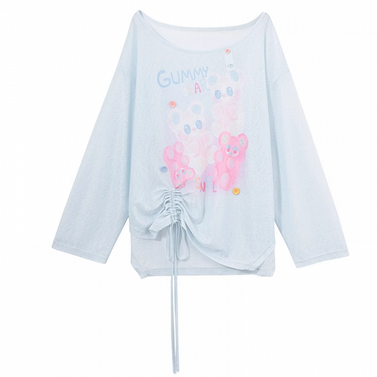 Blau/Pinkes süßes, halbtransparentes Top mit Cartoon-Print und Kordelzug