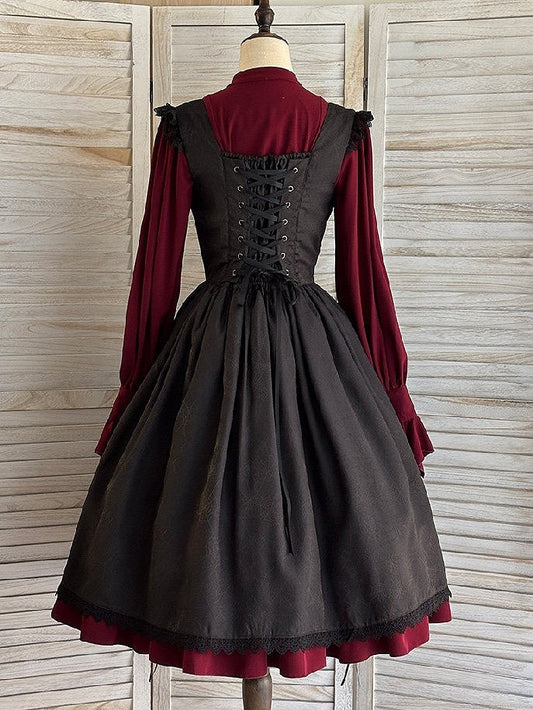 Waist Lolita Gothic Straps Drawstring Cross JSK Basque Dress and Red Shoulder Embroidery with Lace-Trimmed