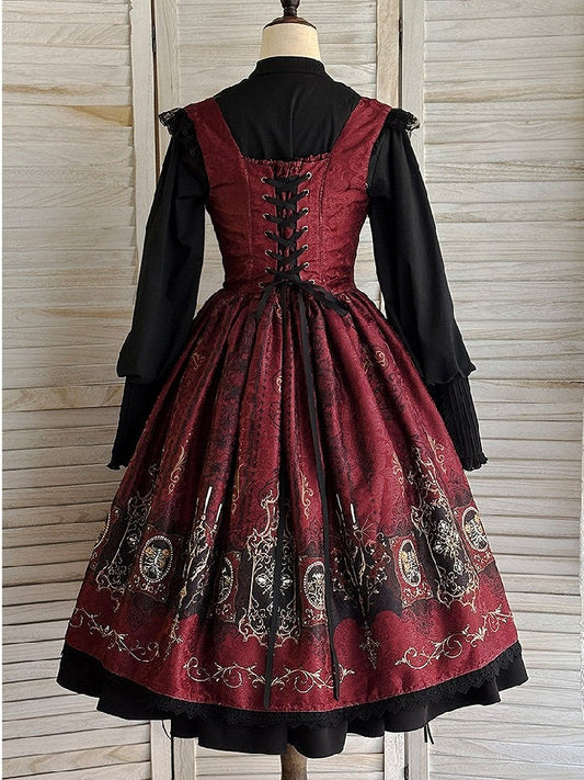 JSK Drawstring Candelabras Wings Bat Gothic Shoulder Straps Lolita with Print Lace-Trimmed Dress Red