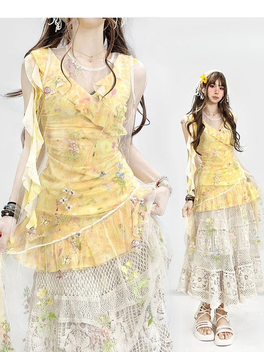 Blumenkleid Weiß Asymmetrisch Gelb Beige Urlaubsset - Transparente Stickerei + Rocksaum