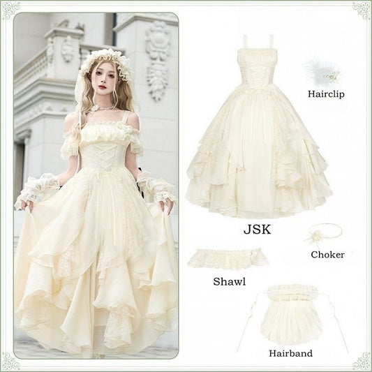 Lolita-Set, langes Kleid, Rock, Taille, klassische Rüschen, kaskadierende Stäbchen, Beige, Baskisch