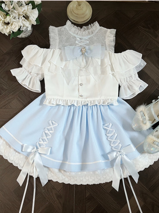 Illusionsrock mit blauen, überkreuzten Schultern, offenem weißem Design, Top + Ausschnitt, Kei-Set Jirai