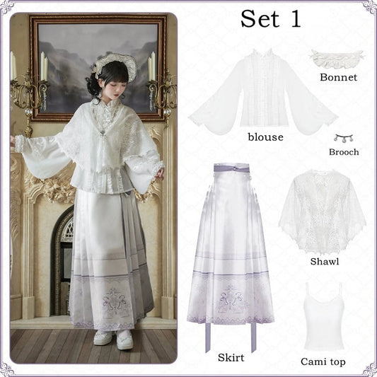 Langer Rock mit Blumenärmeln in Lila + Lolita-Print Han-Pferdegesicht und leichte Bluse in Weiß, Set mit voller Schlangenhaut