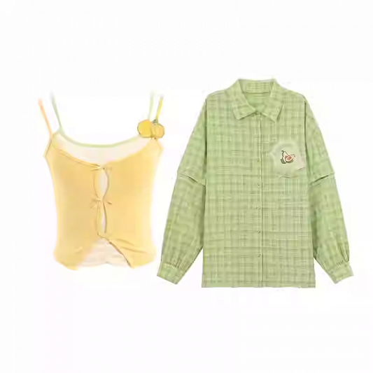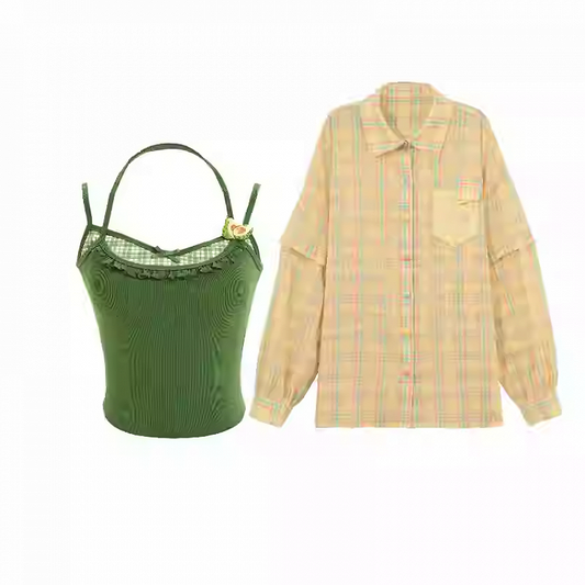 Kariertes Hemd-Set, grünes, zweiteiliges Cami-Top mit gelbem