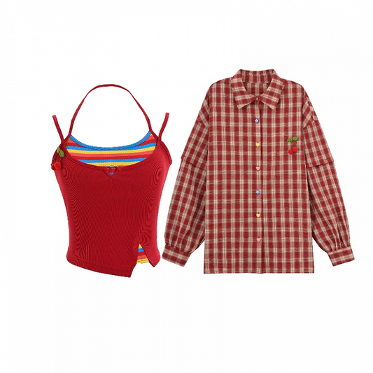 Kariertes Hemd-Set, rotes Faux-Zweiteiler-Cami-Top mit rotem