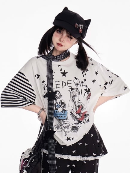 T-Shirt Y2K Cartoon Girl Print Weiß Rundhalsausschnitt Slim-Fit