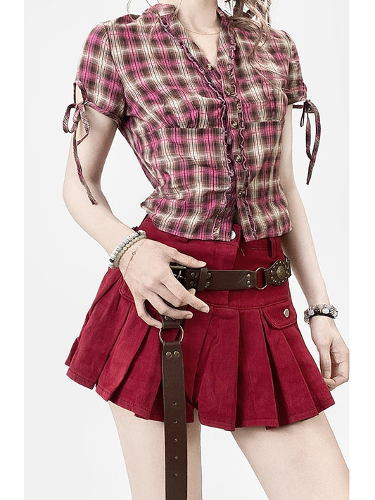 Karierte Ärmel Rüschenbesatz Muster Shirt V-Ausschnitt Y2K Kurz RotBraun