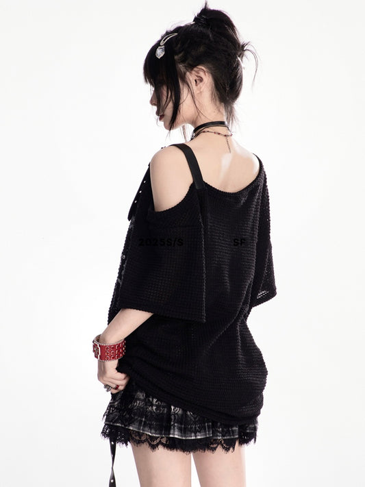 Y2K Schwarzes, asymmetrisches T-Shirt mit Sternträgern und Bittersüß