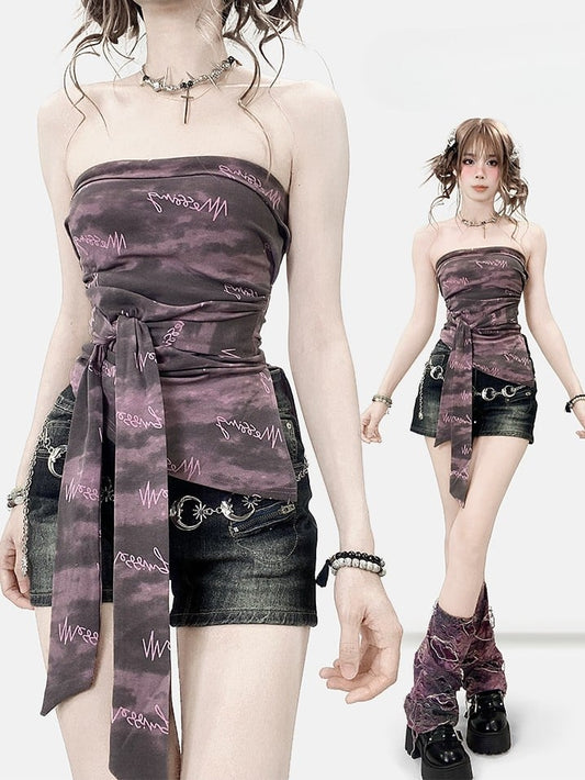 Lila Dye Strap Saum Top Y2K Asymmetrische Bittersüße Tube Selbstbinden Krawatte