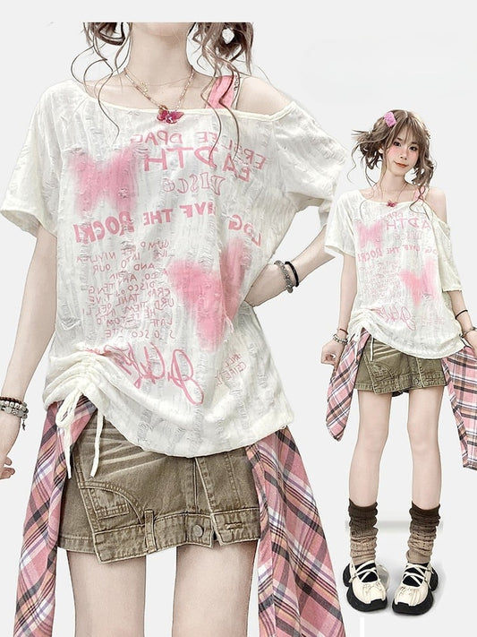 Asymmetrisches Y2K Bittersweet Neckline Letter Butterfly T-Shirt Off-White und Print