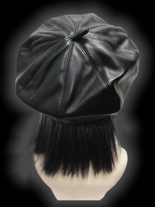 Schwarze Baskenmütze aus PU im Y2K-Stil mit Spitzenbesatz