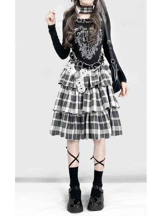 Y2K Schwarz-Weiß Karierter Knielanger Glamouröser Stufenrock mit hoher Taille