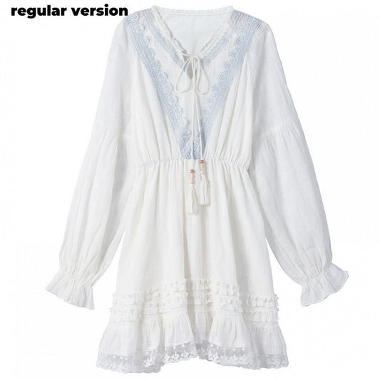 Version Weißes Kleid mit V-Ausschnitt, Spitzenbesatz und Quasten-Kordelzug-Design, Normal/Lang