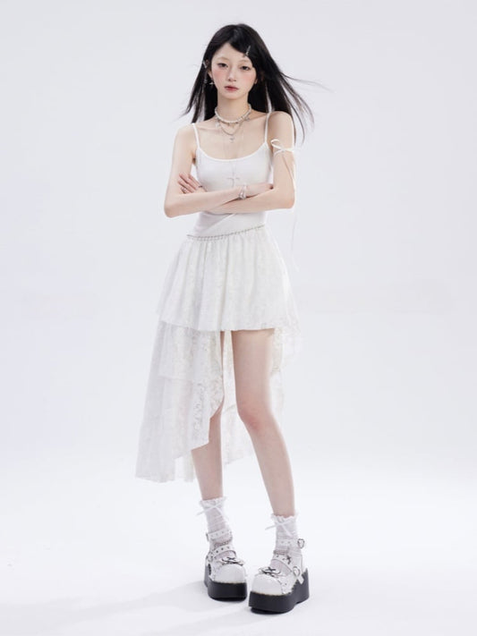 Taille und weißes asymmetrisches Unterkleid mit Spitzensaum und Kettenfrei