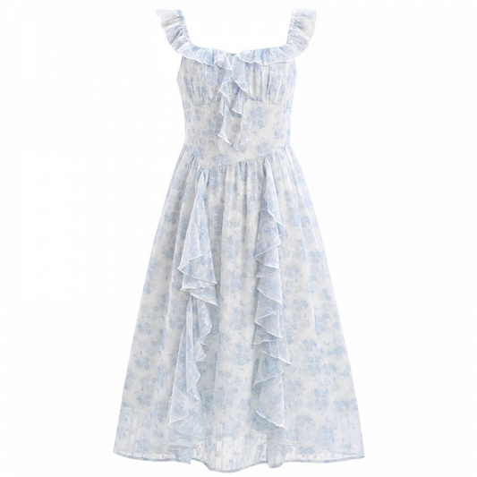 Ärmel Blau Flatter Kaskaden Rüschen Leichte Akzente Floral Ärmelloses Kleid