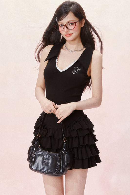 Rock Cami Kleid Big Bow Ausschnitt Schwarz mit gestreifter Taille Abnehmbare Kette Blase