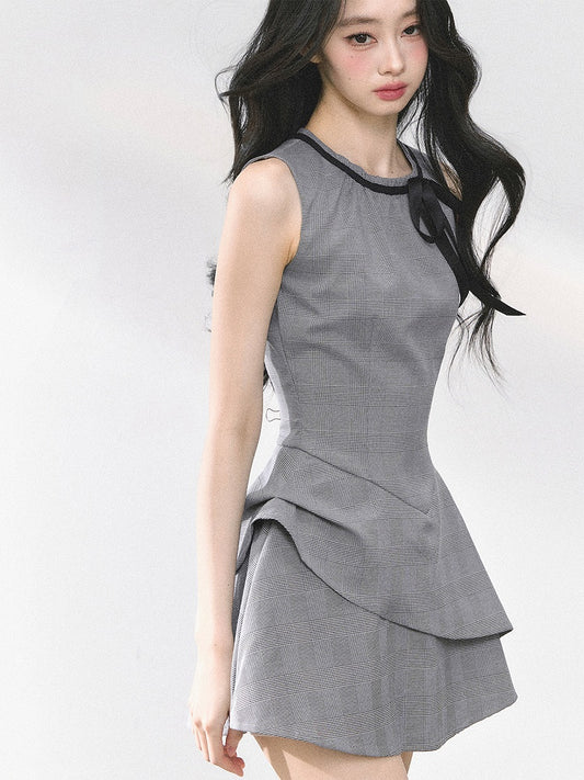 Ärmelloses Kleid Grau Basken-Taille Selbstbinden Ausschnitt Mini