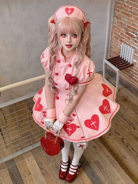 Ärmel Puffkleid Kreuz Krankenschwester Herz Patches Lolita Pink
