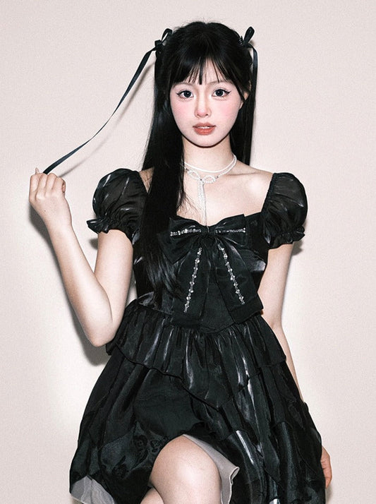 Kurzarm-Set: Shorts mit Rücken und Trägern, zweiteiliges schwarzes Kleid, passendes Jirai Kei zum Binden