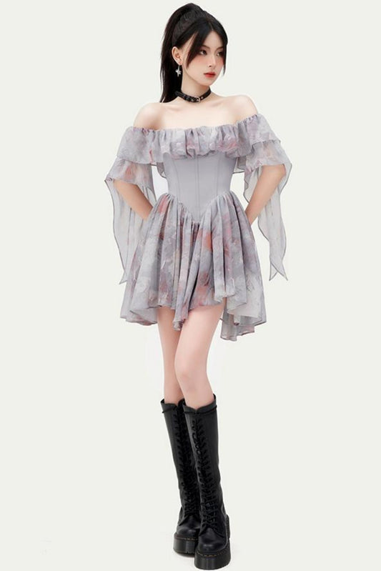 Red Rose Gothic Lace-Up Drawstring Feather Corset Bustier Top Dress
