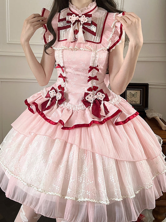 Qi Lolita Froschknopf Cheongsam Kragenkleid Details Stil Quaste Rosa