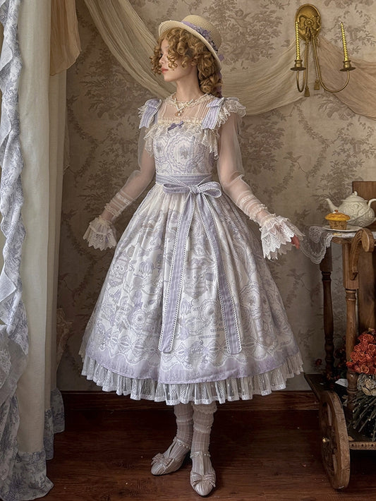 Lily Oil Klassischer Rock Gemäldedruck Wasserviolett Lolita-Kleid mit eckigen Ärmeln und langem Ausschnitt