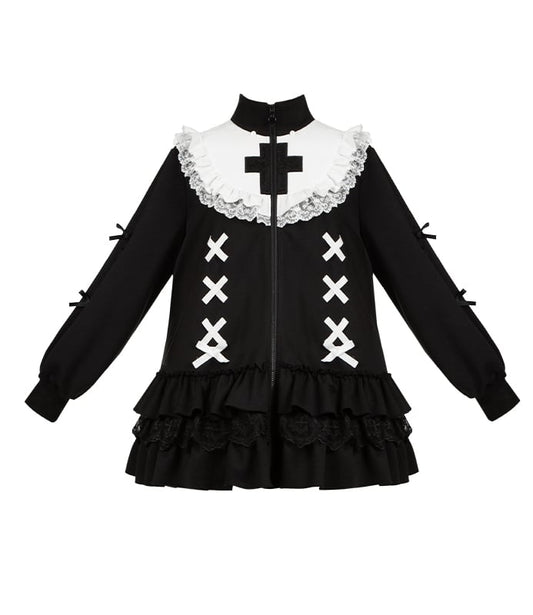 Lagenhals Jirai Cross High Black Jersey Stickerei Saum Kei-inspiriertes Kleid Rüschen