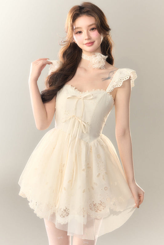 Elegantes weißes Kleid mit quadratischem Ausschnitt, flatternden Ärmeln, ärmelloser Spitze und Schleife zum Selbstbinden