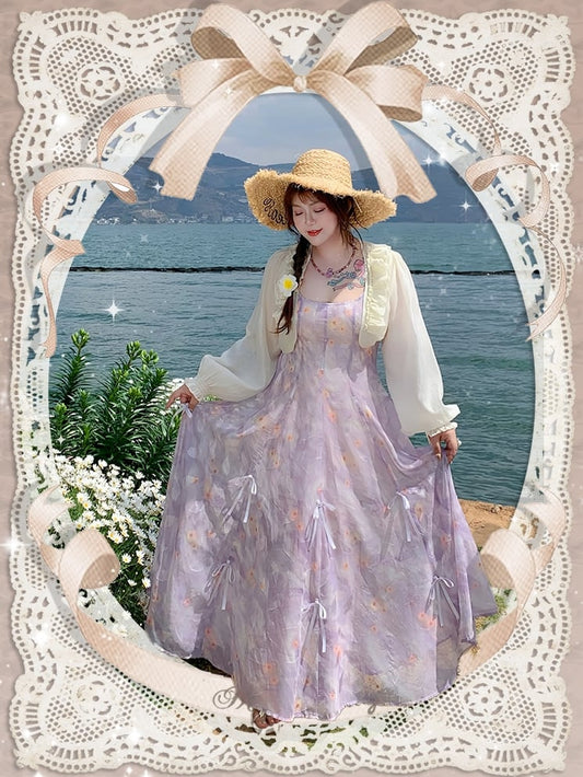 Details Chiffon-Camisole-Kleid mit Blumenmuster, drei Möglichkeiten, Übergröße, lila Schleifen
