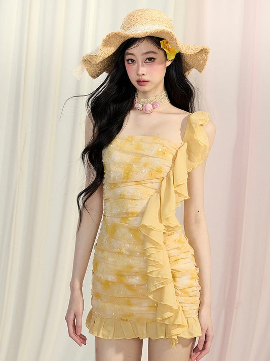 Gelbes, figurbetontes Minikleid mit kaskadierendem Rüschenbesatz und gerafftem Design