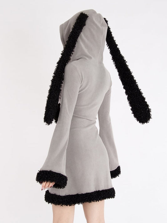 Y2k Graues Kleid mit Hasenohren, Kapuze und Glockenärmeln, Plüschbesatz und Sternträgern