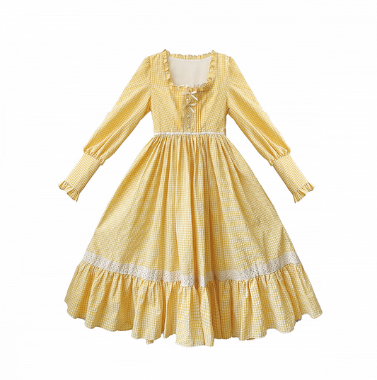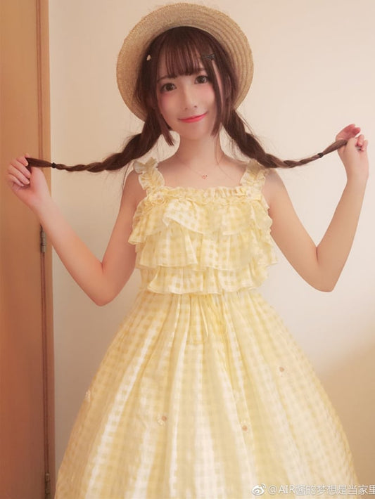 Gelbes Cottagecore Gingham Sommerkleid mit Daisy Lace Trim Plaid Lolita Jumper Rock