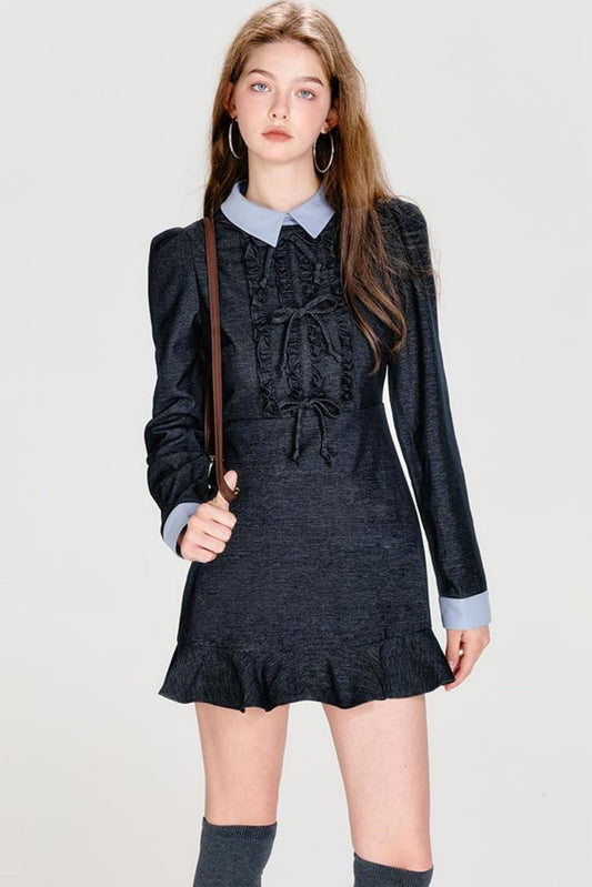Blaues Kleid mit Peter-Pan-Kragen, Walmuster und Schleifen