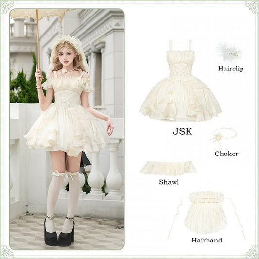 Kleid mit Stäbchen, Rock, kaskadierende beige Rüschen, klassische Version, kurzes Basken-Set, Taille, Lolita, voll