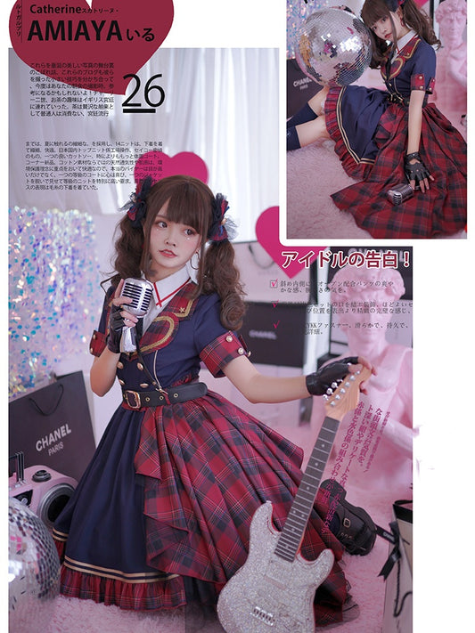 Blaues Kleid mit Kontrast-Rotkaro und goldfarbenen Knöpfen, Idol Lolita OP