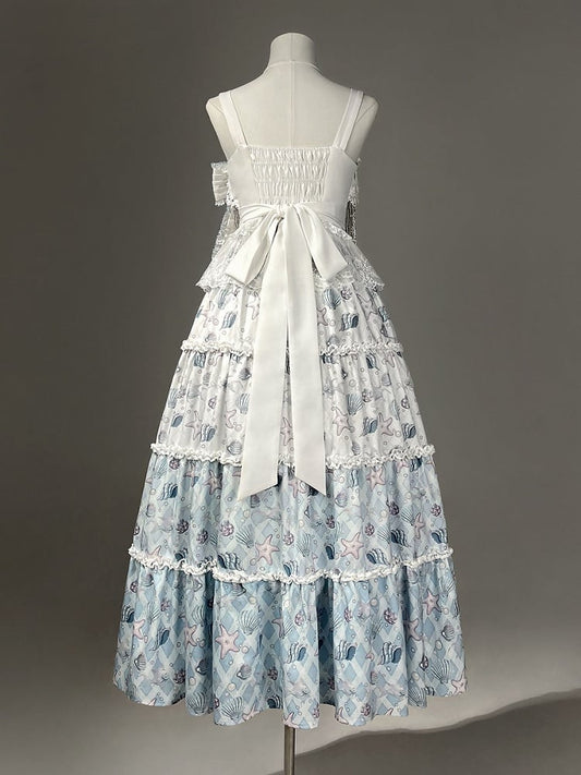 Blaues Lolita-Muschelkleid mit weißem Meeresdruck und Seesternen