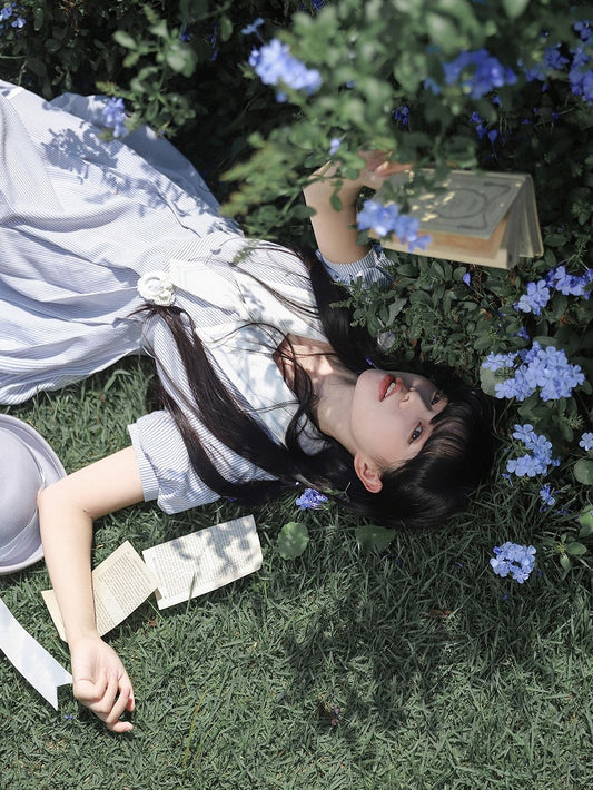 Weiß Gestreiften und Kleid Sommer Ärmeln Taille Puff Blau Gürtel mit
