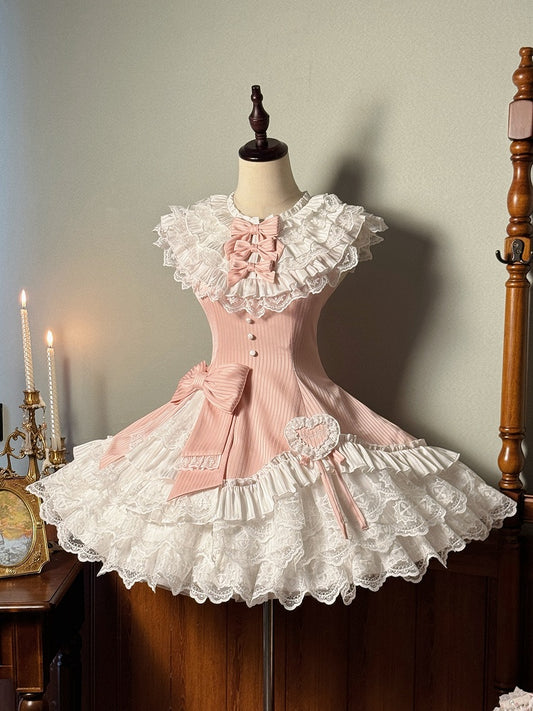 White Sleeveless Pink Dress Slim Striped Layered Neck Fabric Lolita Ruffle Sweet Waist Fit