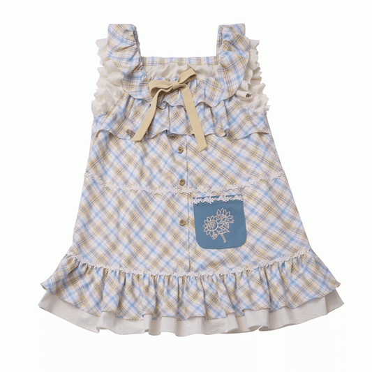 und kariertes Cottagecore-Kleid mit gestuften Flatterärmeln, gelbes Kleid mit abnehmbarer Schleife, blau