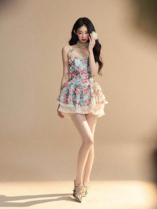 Akzente Blau Ölgemälde Druck Floral Schmetterling Slip Kleid Rüschen Mini Trim und