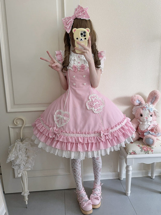 Rosa Lolita-Kleid mit Rüschen und Krankenschwester-Saum, gepunktetem Lagenmuster