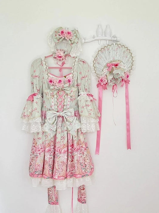 Mintgrünes Lolita-Kleid mit Rosettendruck, inspiriert von der Rokoko-Mode, quadratischer Ausschnitt, Glockenärmel, OP/komplettes Set