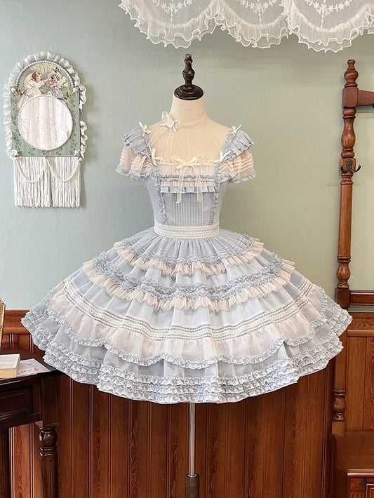 Sommer-Lolita-Kleid mit blauem Bubble Puff-Rock und Baumwollärmeln