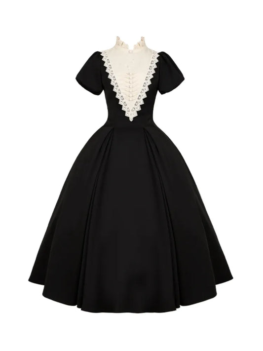 Schwarz-beiges Gothic-Nonnen-Lolita-Kleid mit Rüschenkragen, kurze Version