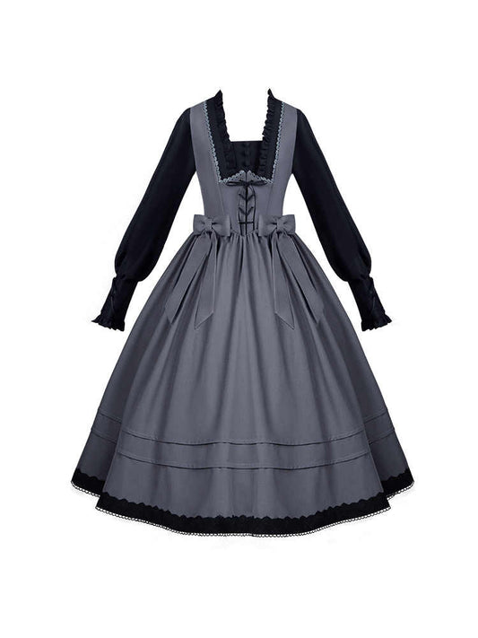 Elegantes Lolita-Kleid mit quadratischem Ausschnitt und langen Bischofsärmeln in Schwarz und Grau