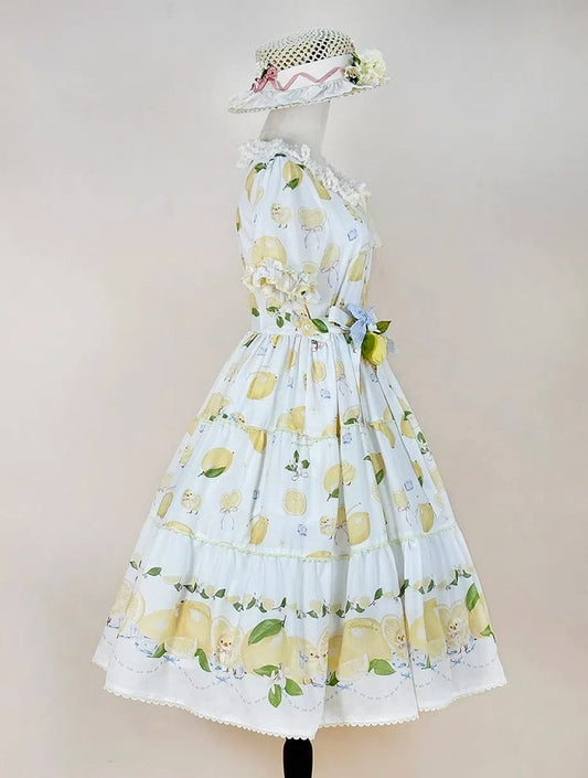Kükenärmel für kurzes weißes Lolita-Sommerkleid mit Print und Zitronen-Frühling