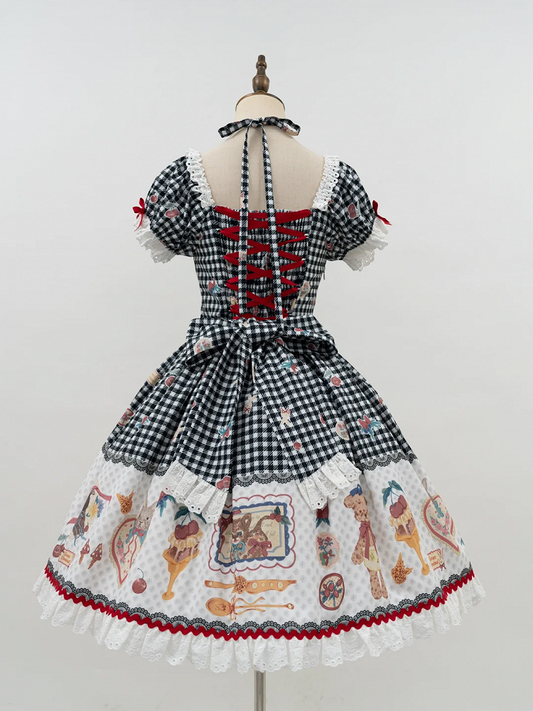 Süßes Lolita-Kleid mit schwarzem Print und kurzen Ärmeln im Kitty-Teddy-Gingham-Stil
